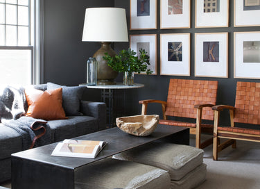 To add a base note to the otherwise all-white house, we painted the den Kendall Charcoal by Benjamin Moore (and matched the trim in the same dark color). Furnishings are a mix of old - vintage ceiling light and corner table by City Foundry - and new - like the woven leather chairs from Bobo Intriguing Objects. We designed the custom metal waterfall coffee table and the sofa is a buyout sectional from West Elm. Leather pillows were custom and the blanket is by Nordic Knots. Lamp is vintage from local Beall and Bell, and the art is a DIY in Blick frames.