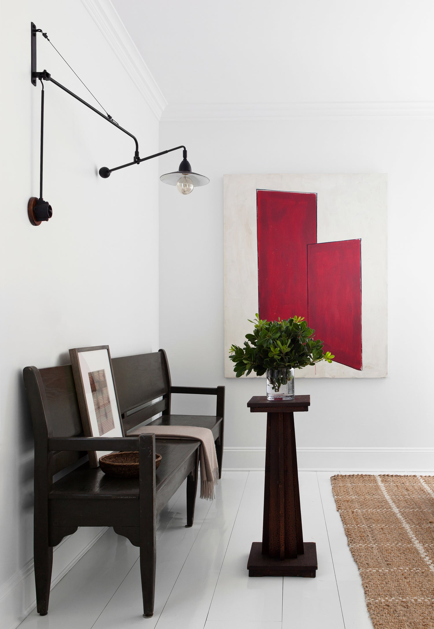 In this entry, light and lovely was the rule: somewhere to take off your shoes, drop your keys (and your shoulders) and to say welcome. White glossy floors are a fav: Sherwin Williams Armorseal Rexthane. Black doors are painted in Hollandlac from Fine Paints of Europe, with Emtek hardware. Stair runner is a black sisal from Misha carpet. Vintage pieces like the table from Beall and Bell and lamp from Jon Howell Antiques. Mix with new: the metal chair is from Terrain and the basket is from Seaport Flowers in Brooklyn.