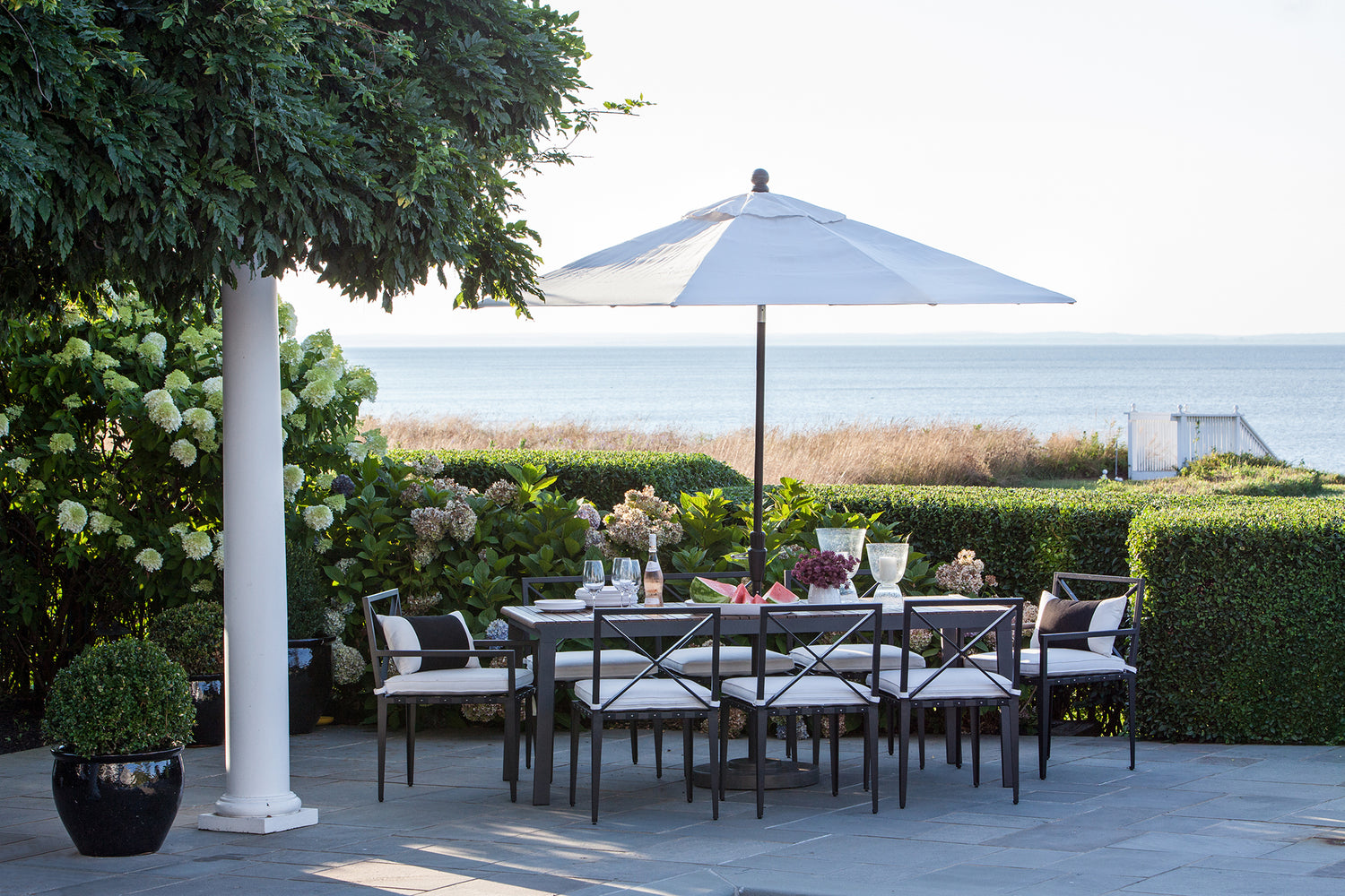 With views of the water, who wouldn’t love a glass of Rosé poolside? Our preference is Ott Rosé, with glasses from Riedel, and hydrangeas cut from the year. Classic cabana stripe pillows from Restoration Hardware add a little cushion to this Restoration Hardware outdoor dining set, topped with an umbrella by Crate and Barrel.