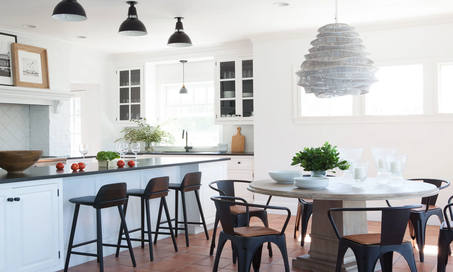 New countertops and new paint went a long way in this kitchen. The design was already beautiful - we just zhuzhed it with flushmount industrial lights from Rejuvenation, a new woven bee-hive pendant from Forma Living, new hardware from Just Knobs and Vigo faucet from Overstock. Stools are Design Within Reach, table is Taramundi, and chairs are Bobo Intriguing Objects. Frames over the stove are vintage from the Paris flea market.