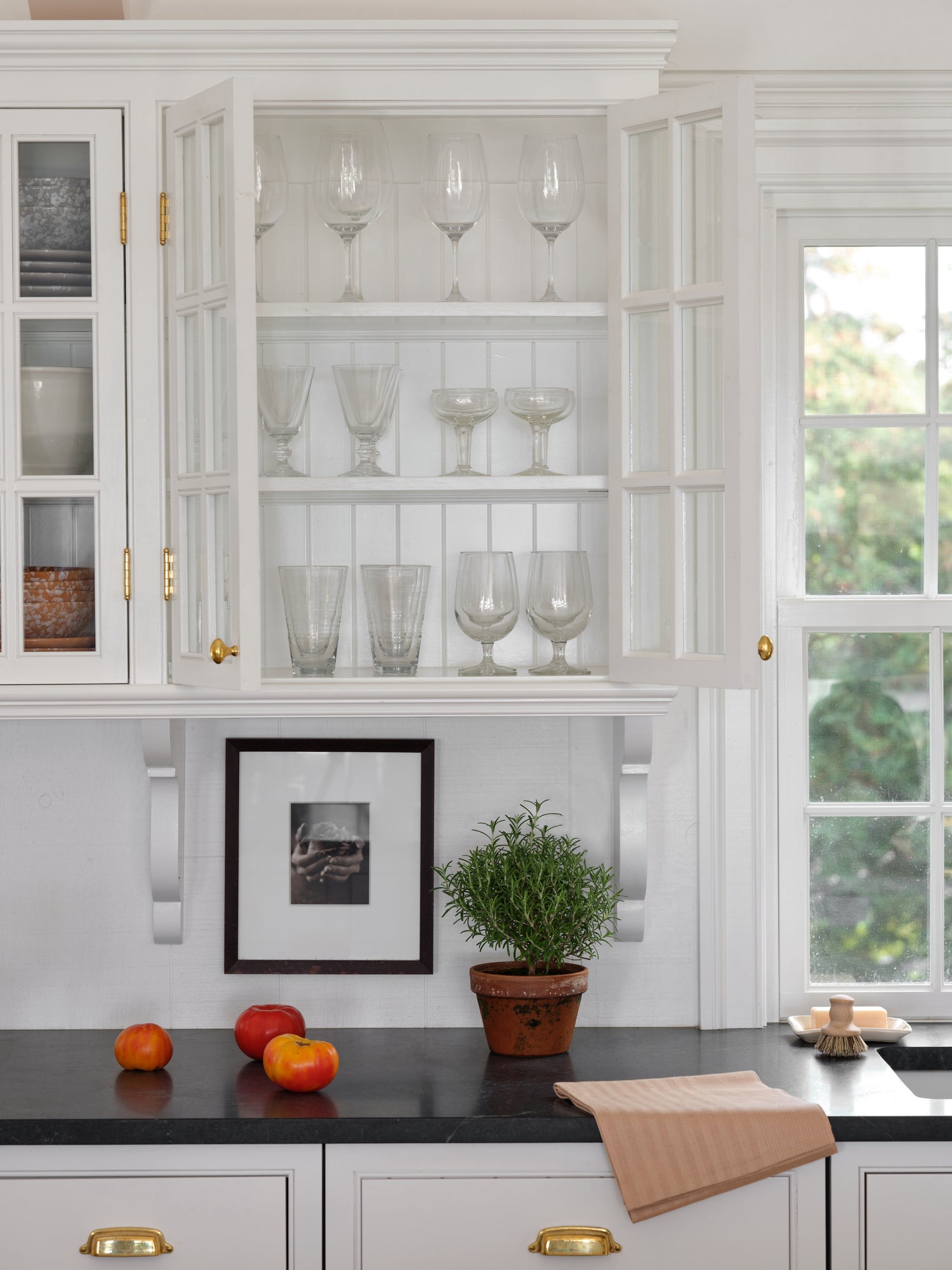 We added a window to the end of the kitchen, letting in all the southern light. It’s amazing how this one little move made the whole room feel different. Throughout, cabinets are painted Chantilly Lace, and decorated with unlacquered brass hardware from Top Knobs.