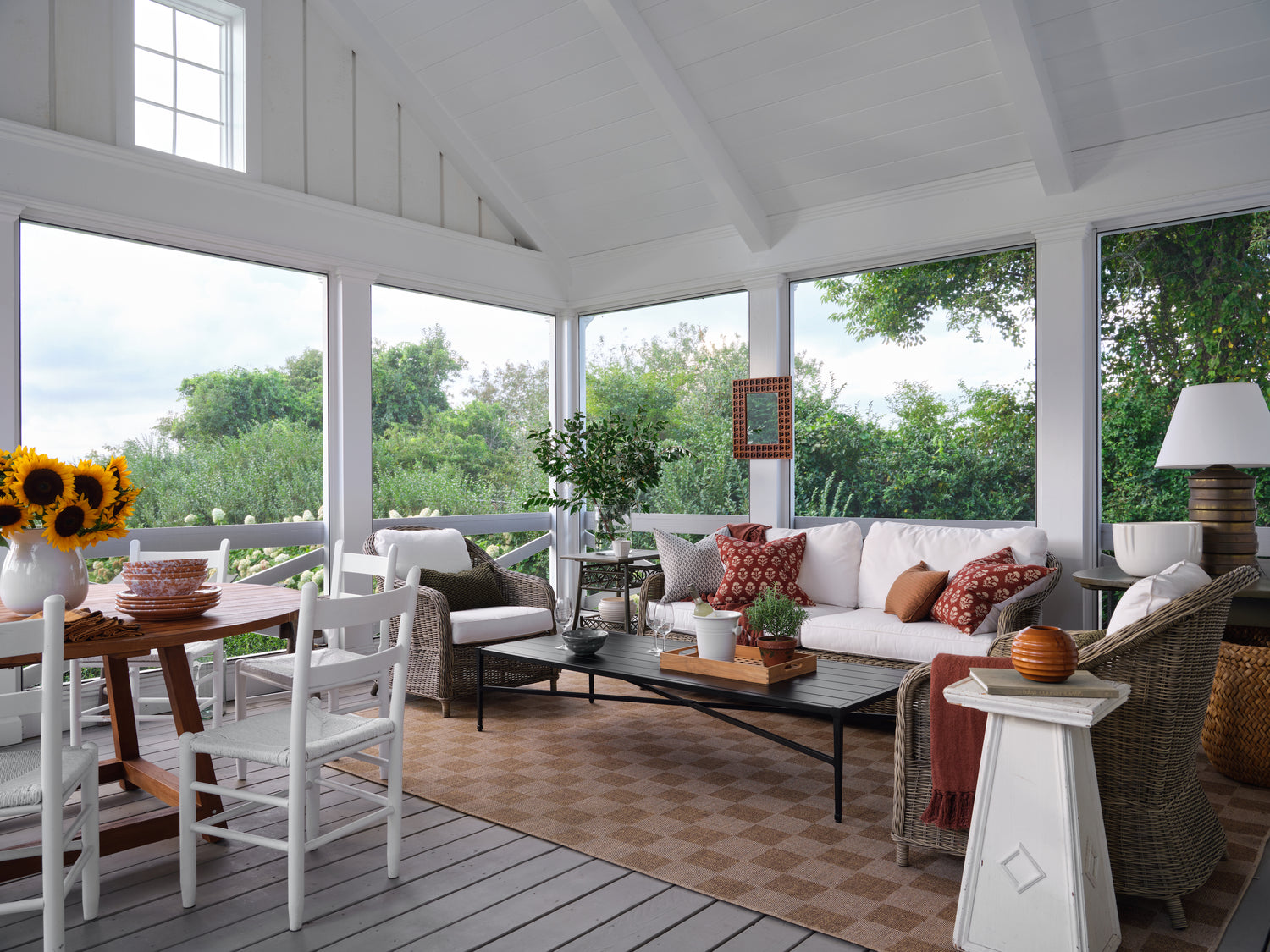 Inspired by a porch of a house that got away, our outdoor room nearly doubles the square footage of our indoor entertaining space. I added the little window in the peak to give it more of a sense of “room,” an idea that’s echoed in the ceiling detail that mimics those inside.