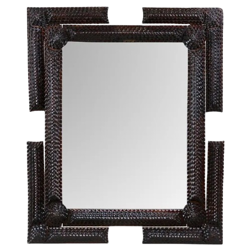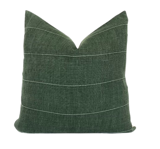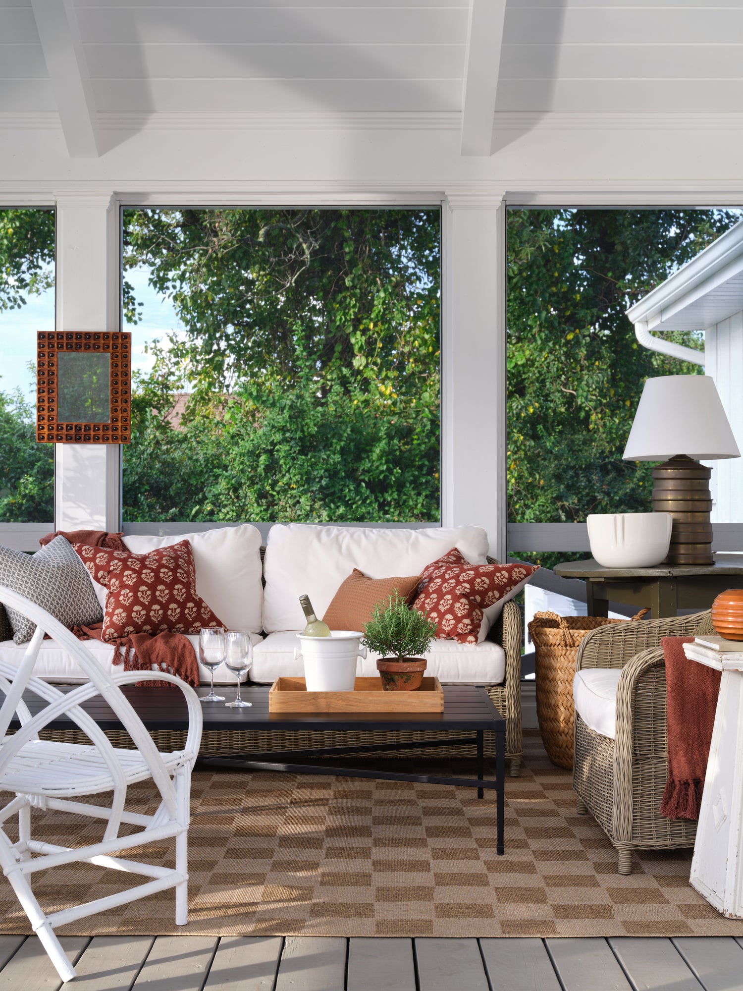 Vertical detail - Here too, everything is a mix: I repainted an old dining table the same green as our interior doors to anchor one end of the Williams Sonoma sofa and chairs. The coffee table is RH, the rug Wayfair, pillows from Etsy and throw blankets are Annie Selke for crisp evenings on the porch. Signature DanMazz move: hang a mirror (or piece of art) over a stile, seen here on a porch column.
