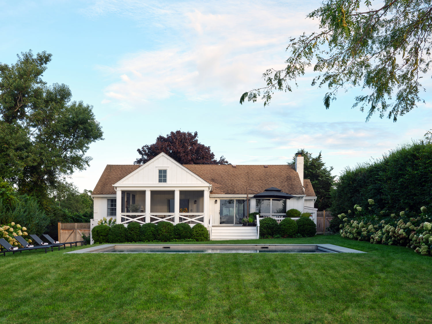 Before we finished our interior, I drew a napkin sketch for our amazing builder of a porch we’d seen on another real estate tour. He built us our little screened in porch in no time, a now favorite room for warm weather dinners all season long. Part of the exterior plan was a paint job (cue my usual black and white!) and landscaping. We kind of went hog wild, installing a fully mature hedge, about 40 huge boxwoods (because I’m impatient,) 60 hydrangeas and…the pool! Pools, as it turns out, are no joke to build – it was as close to the movie The Money Pit as I’ve experienced. One day, I got a call: “it's digging day,” and a crane showed up in our yard. It took longer than expected, but in the end, we had our pool overlooking the water, and our checklist was finally complete.