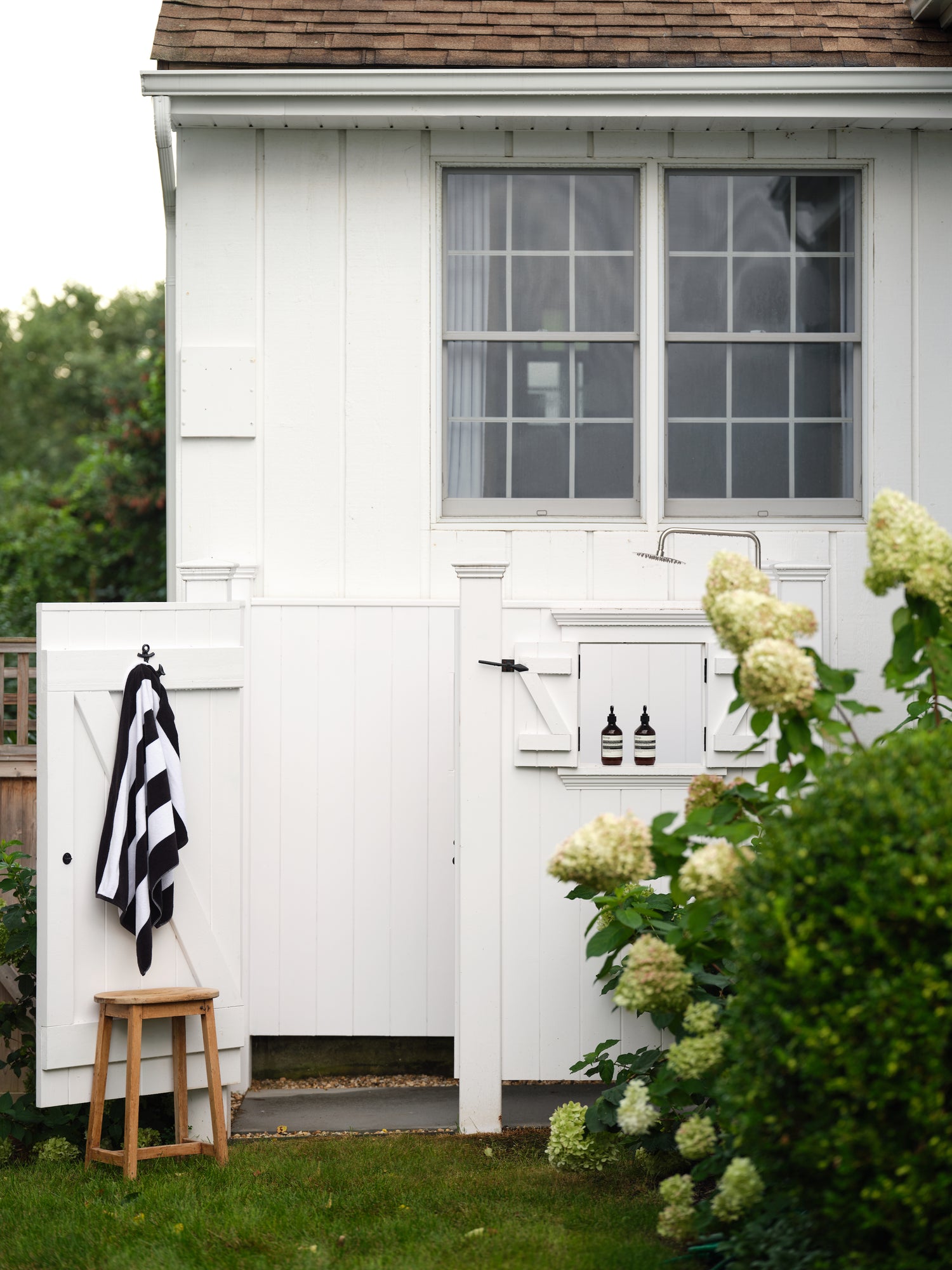 There’s no better shower than an outdoor shower. I asked our contractor to build us this one based on a favorite Napa Valley hotel. I added the little window and shutters for a view of the water while you’re sudsing up. Hydrangeas are Limelight, stool is vintage and the striped towels are from Wayfair.