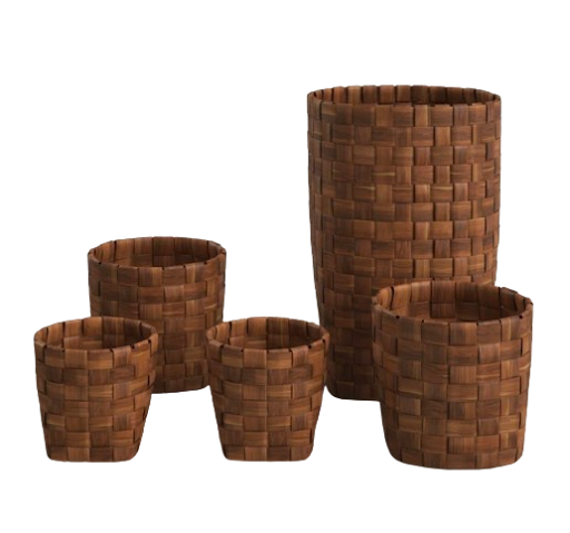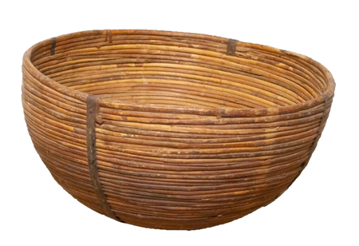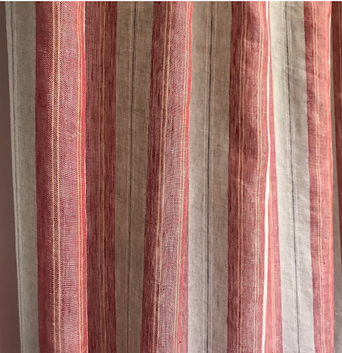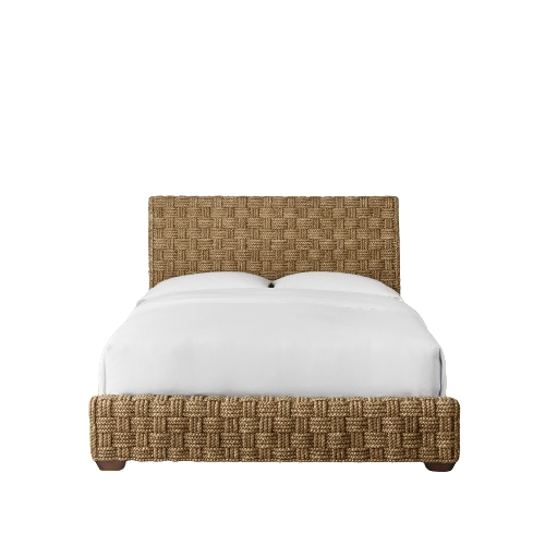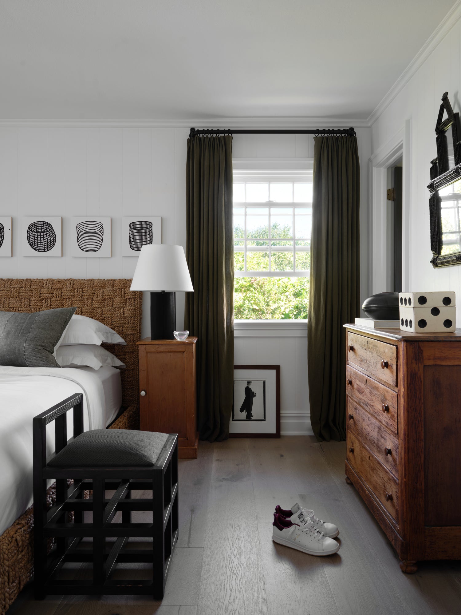 Pieces were reimagined from our Greenport house for our new primary – the dresser, nightstand and stool came over in the move. The woven bed is new from Williams Sonoma, the lamp is Paloma Contreras for Visual Comfort. The basket paintings are by my friend Michael McGuire; the KD Lang portrait was picked up at a local yard sale, and the dice box was a gift from a friend. Drapes are Pierre Frey.