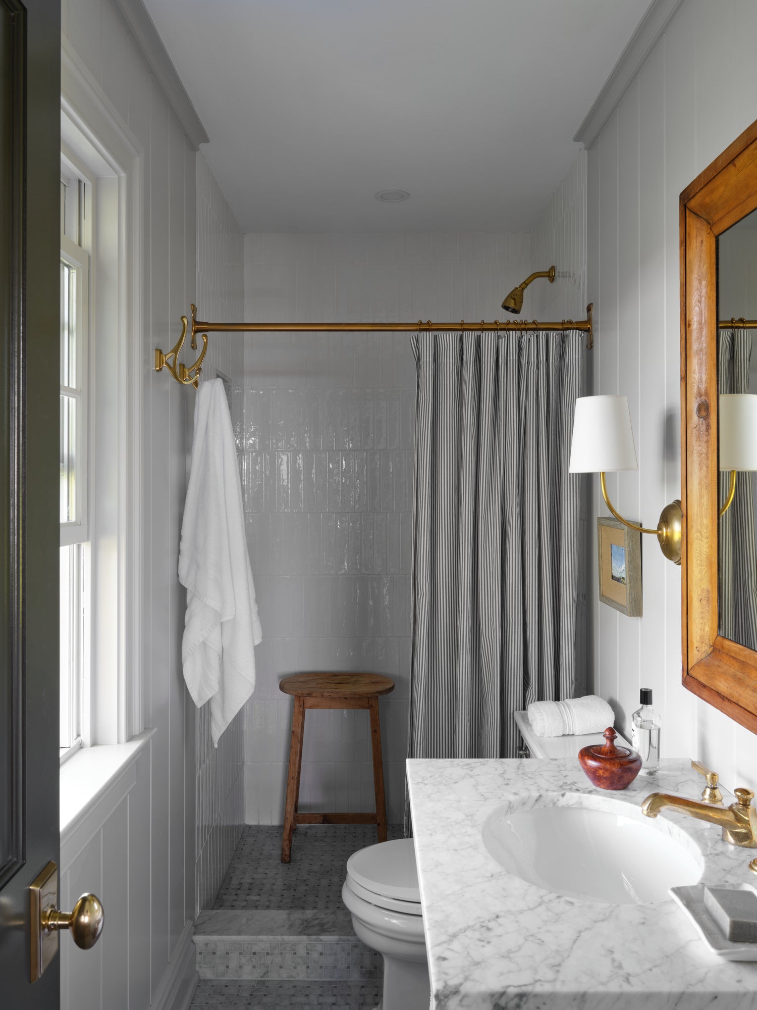 New v-groove walls and tile in a vertical running bond (a DanMazz signature move,) gave this tiny bath new life. I used a buyout brass base and marble topped sink with Newport Brass faucet and partnered it with a vintage mirror that I converted to be a medicine cabinet for a little vintage cottage appeal. The ticking stripe curtain is Pottery Barn. Sconces are Thomas O’Brien for Visual Comfort, and the art by local painter Amy Worth.