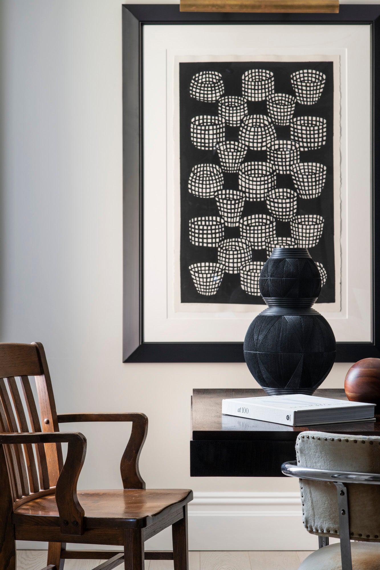 Every dog will have his day, and Merle is always super comfy on our custom sofa in Mulberry fabric. The side table was vintage from a Ralph Lauren shopping trip, and the glass lamp was from Harrods home store. The large art is by Ximao Miao, and the black pottery is my collection from the talented Andy Bissonette. Oh - and the Barcelona ottoman was found on the sidewalk on the Upper East Side. (Don’t worry - I reupholstered it long ago.)