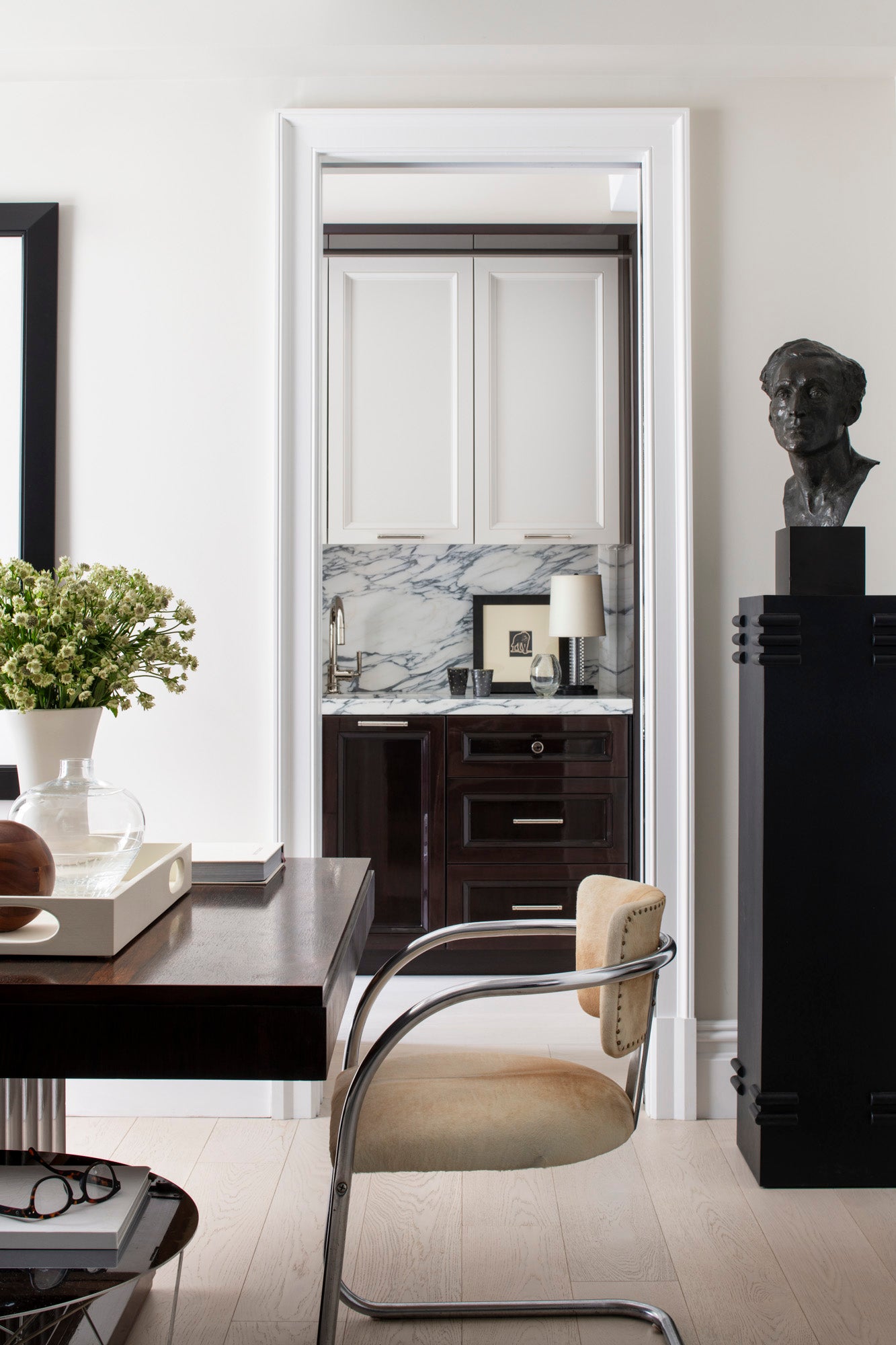 The kitchen - once cramped and an awkward scattering of old appliances, got an overhaul. I pictured this glossy sort of hotel room kitchen - something that functioned well, and looked just as great when not in use. I designed a mix of high gloss mahogany, reeded glass, and Collingwood painted cabinets, and topped them all with Arabescato marble slabs. Appliances were chosen to be clean and discrete.