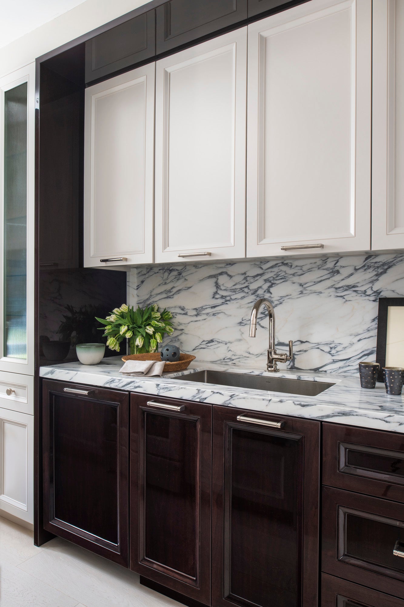 I didn’t want an all white kitchen, so I mixed Collingwood painted cabinets with high gloss mahogany, reeded glass, and Arabescato marble. I also placed all my pulls horizontally - I like the visual line they make. The white Le Creuset was a house warming gift from me to Andy.