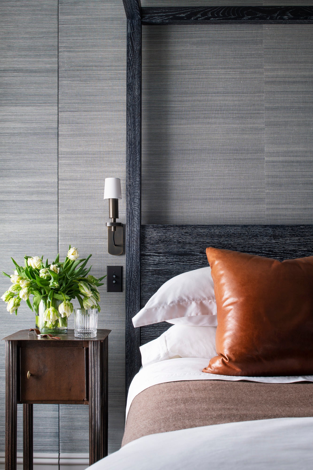 Innovations grasscloth is a quiet texture for the bed. I bought this little but extra-tall table at Beall and Bell in Greenport, NY. Leather pillows are from my last apartment, a signature move.