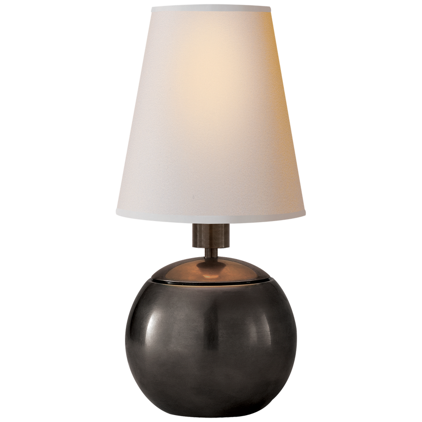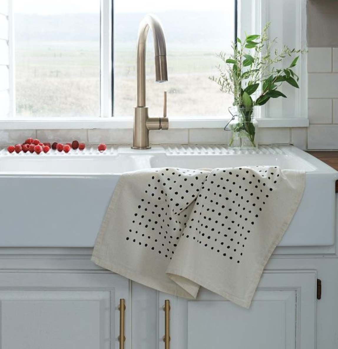 Sneak peek in the kitchen - a vintage French etching pairs with a lucite Thomas O’Brien table lamp. A pair of polka dot mugs from the Northern Clay Center sit with a bubble glass vase, a gift from a friend.