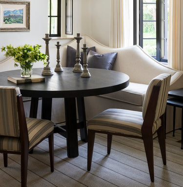 The front rooms of the house were formal, and rarely used, so we aimed to give them purpose and meaning. A Texas-sized living room became a dual purpose living and dining space. We used the centered fireplace to divide the room in half, anchoring the far end with an existing mohair daybed and new vintage leather chair, and the other with a custom banquette and round dining table.