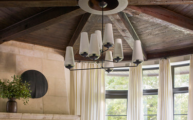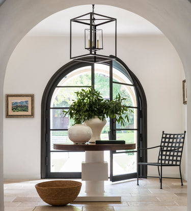 Welcome home - four stuccoed arches ring the Bernhardt table and Visual Comfort ceiling light. The metal chair from Thos. Baker was pulled in from outside; art is vintage from the Paris Flea market, and the basket is from Calvin Klein Home.