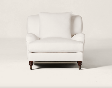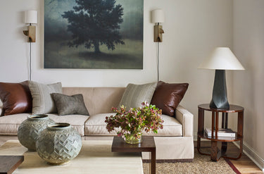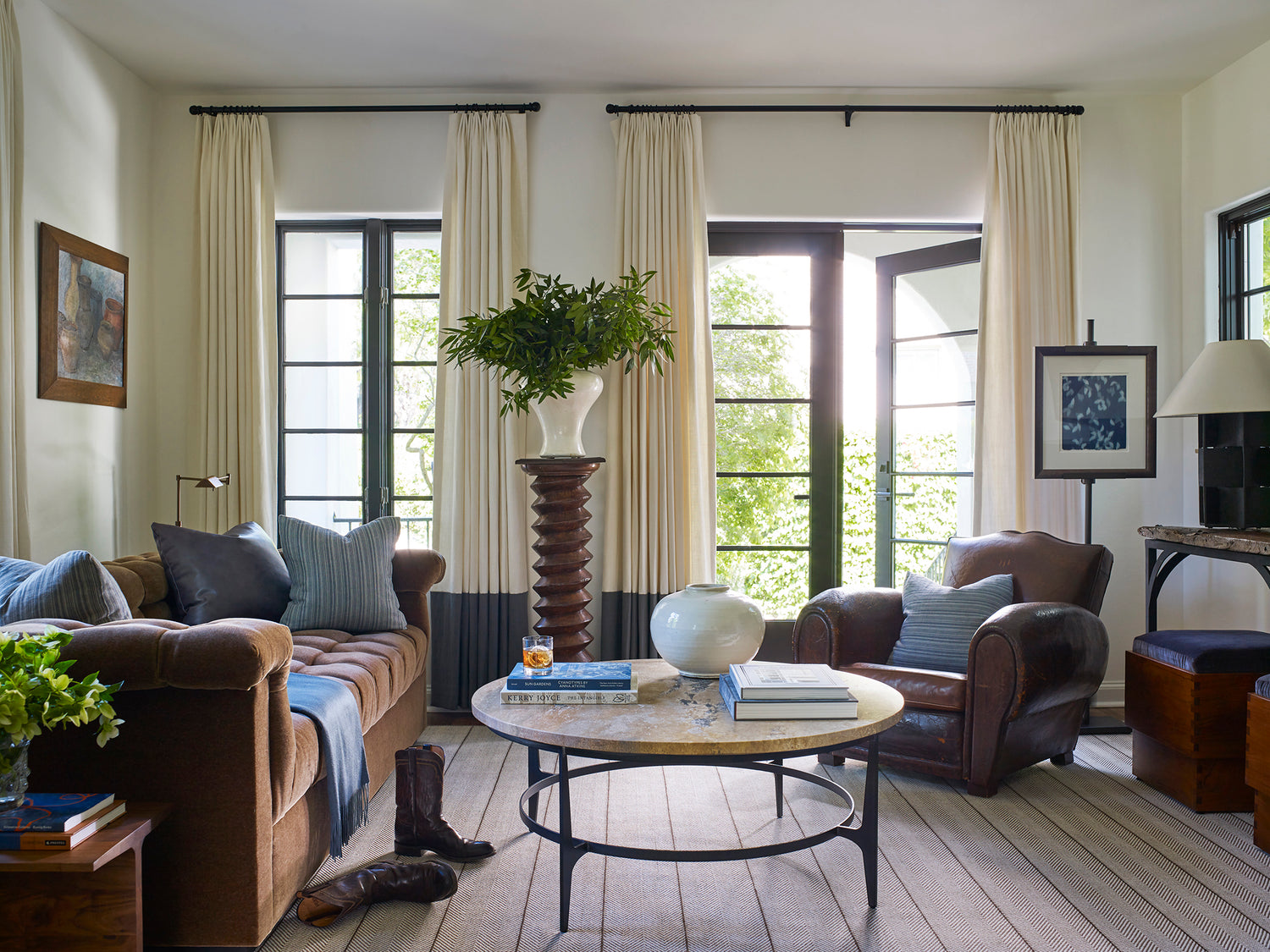 A vintage leather chair from Jean Marc Frey and custom BHDM-designed daybed pair with tables from 1stDibs and Future Perfect to anchor the living room conversation space. Custom rug is from Misha Carpet, the pedestal is a local Austin vintage find; art is Isabelle Bigalow from Sears Peyton Gallery, displayed on an easel from Ballard Designs.