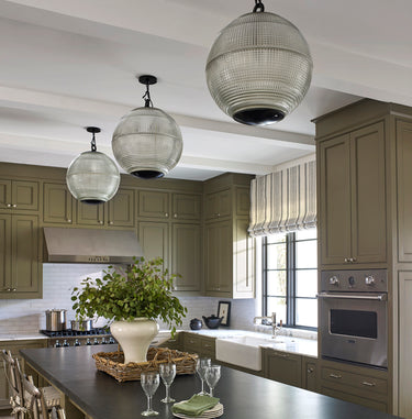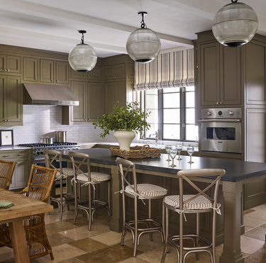 Removing a wall opened up and reoriented this kitchen to be the hearth of the home. We painted the new cabinets a loden green, and added the grid of vintage holophane lights from Paris. The table is Restoration Hardware, chairs are Grange in a Ralph Lauren Home stripe, Chairish wingbacks received new white Perennials slipcovers, and barstools are from Ballard.