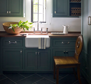 Laundry rooms are utility no longer: here, custom cabinets in Benjamin Moore Rainy Afternoon, walnut counters and an apron front farm sink from Rohl with bridge faucet from Kallista are decorated by vintage flea market lights and a chair from Jasper by Michael S. Smith.