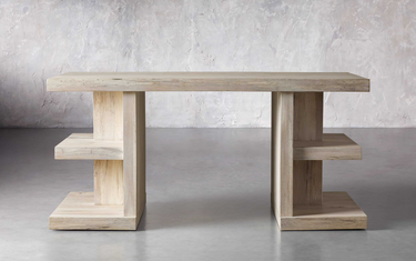 The new pedestal desk from Hickory was floated in the middle of the home office, atop a rug from Williams Sonoma and with a black lamp from Comerford Collection. Nearby, a black and white Thom Jackson photograph decorates the wall, and a custom leather wingback chair partners with a vintage wood table from 1stDibs.