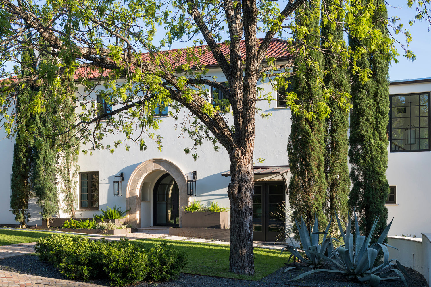 A curved doorway sets the tone for this Spanish Colonial-inspired Austin home, with front door by Rehme and gas lanterns from Legendary Lighting in Flowood, Mississippi. Landscaping was updated to reflect a more “Texas via California” narrative.