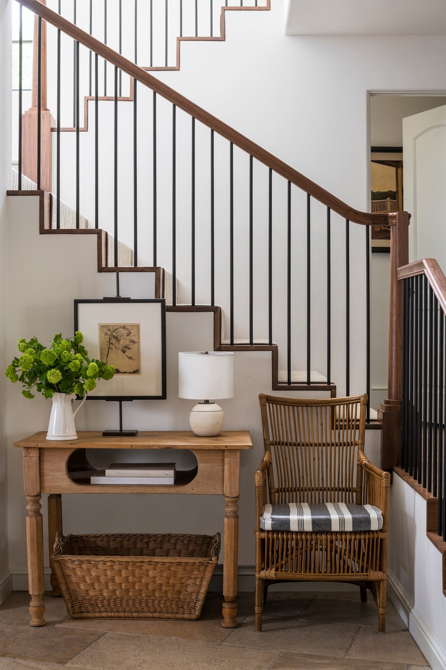 We opened up the staircase seen from the kitchen to let in more light and updated the look of the railing to match the new vibe of the home. In the new nook beneath, we paired a vintage pine table from Whiteflower Farmhouse with a dining chair, lamp from Victoria Morris Pottery, and Etsy art on a Ballard easel.