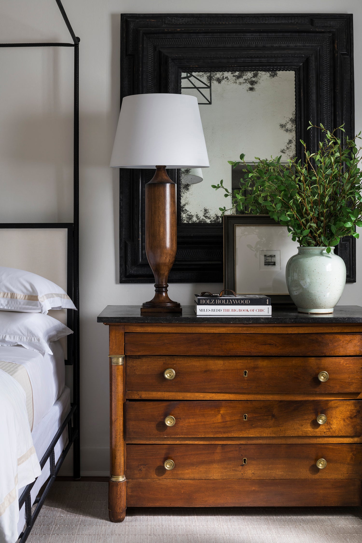 More than a nightstand, this antique French chest of drawers and mirror from Formations pair with a wood lamp from Barbara Cosgrove to create a room anchoring tableau. Art is Etsy, and vase is Aero.