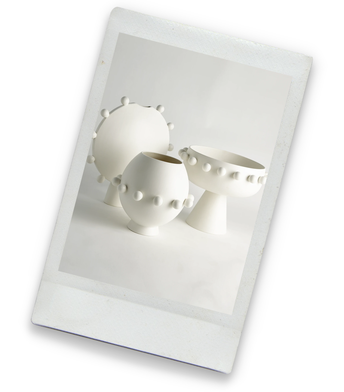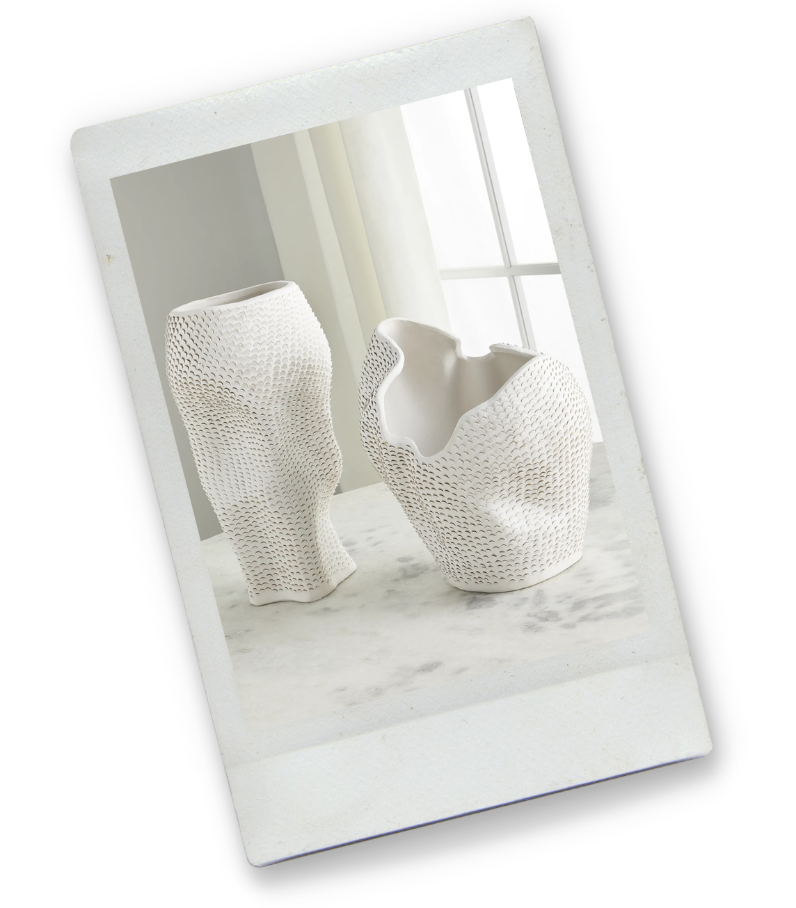 White glazed porcelain is organic in form and embellished with intricate, hand-carved patterns.