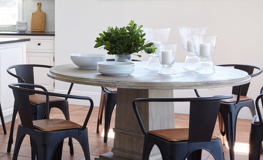 The woven back of the Dale Dining Chair provides comfortable support when sitting and stunning visual detail when pushed in.