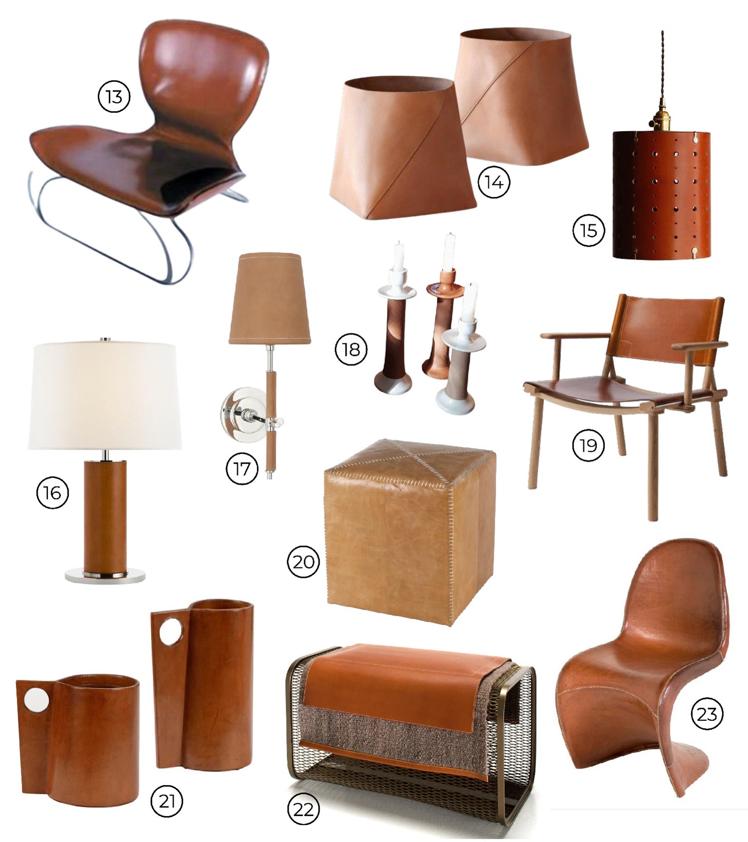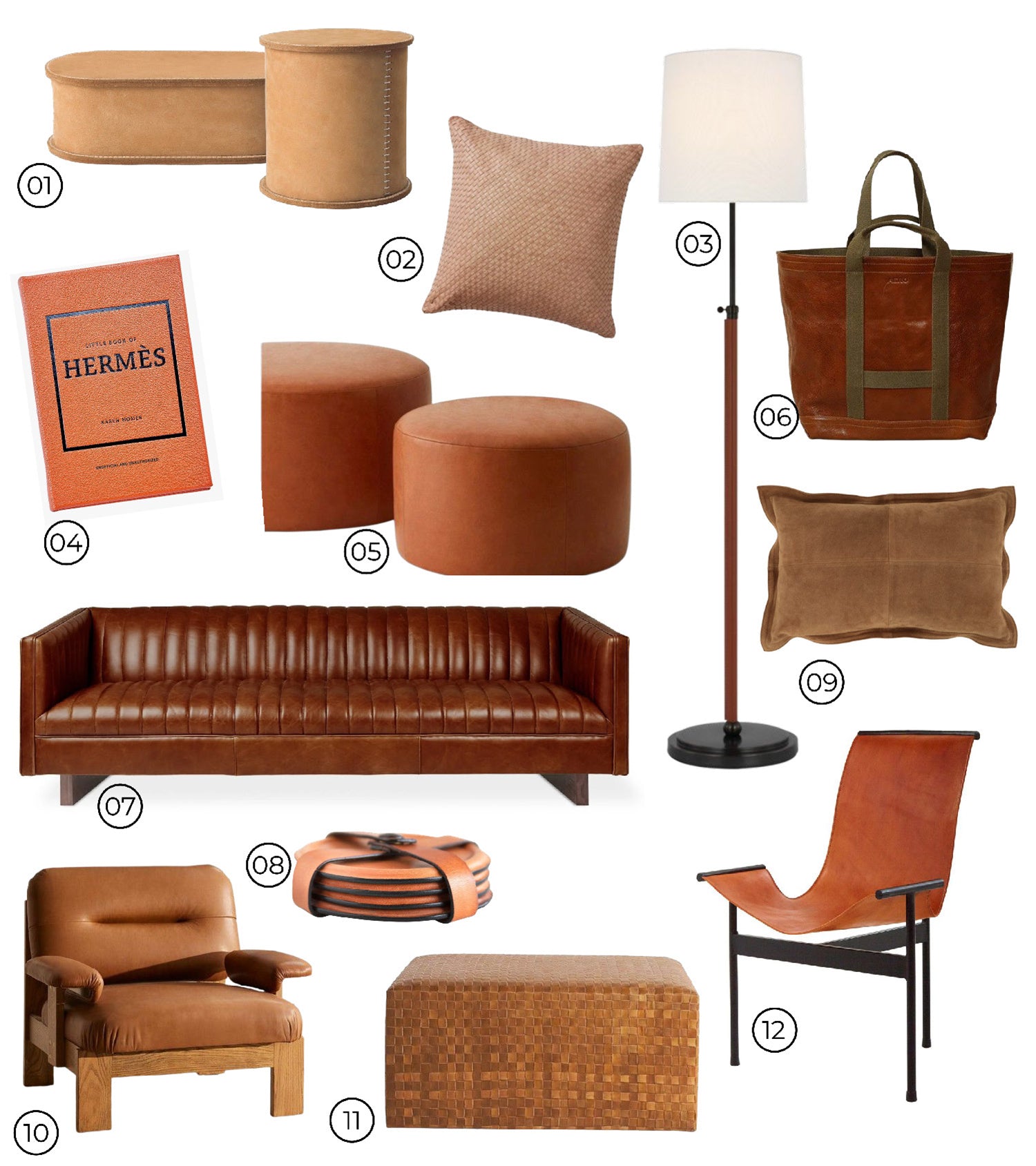 At Archive, we’re sharing some of our favorite leather finds. Woven pieces like Soho Home’s woven leather ottomans and Zara Home's woven and wood lounge chairs blend maker qualities with polished appeal. Our friends at Lostine and Jayson Home take a more form-fitting approach, by directly gluing the material to seats, chairs, and objects for a second-skin fit. (check out the leather watering cans!) Top-stitched and channeled details define a timeless but updated look of pieces from Anthropologie, Field & Supply, Saint Laurent, and Laviva Home.