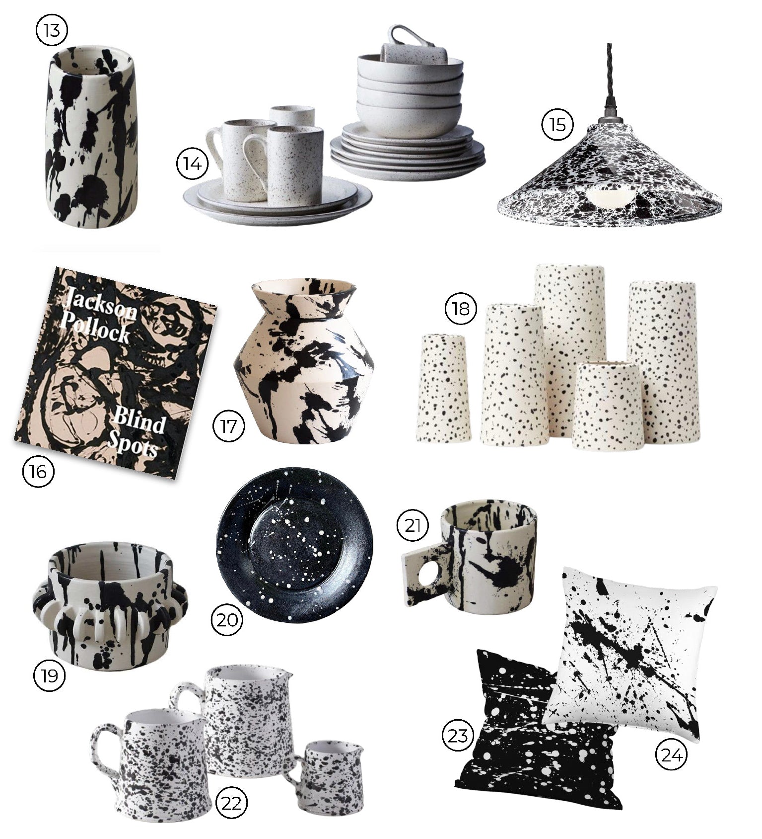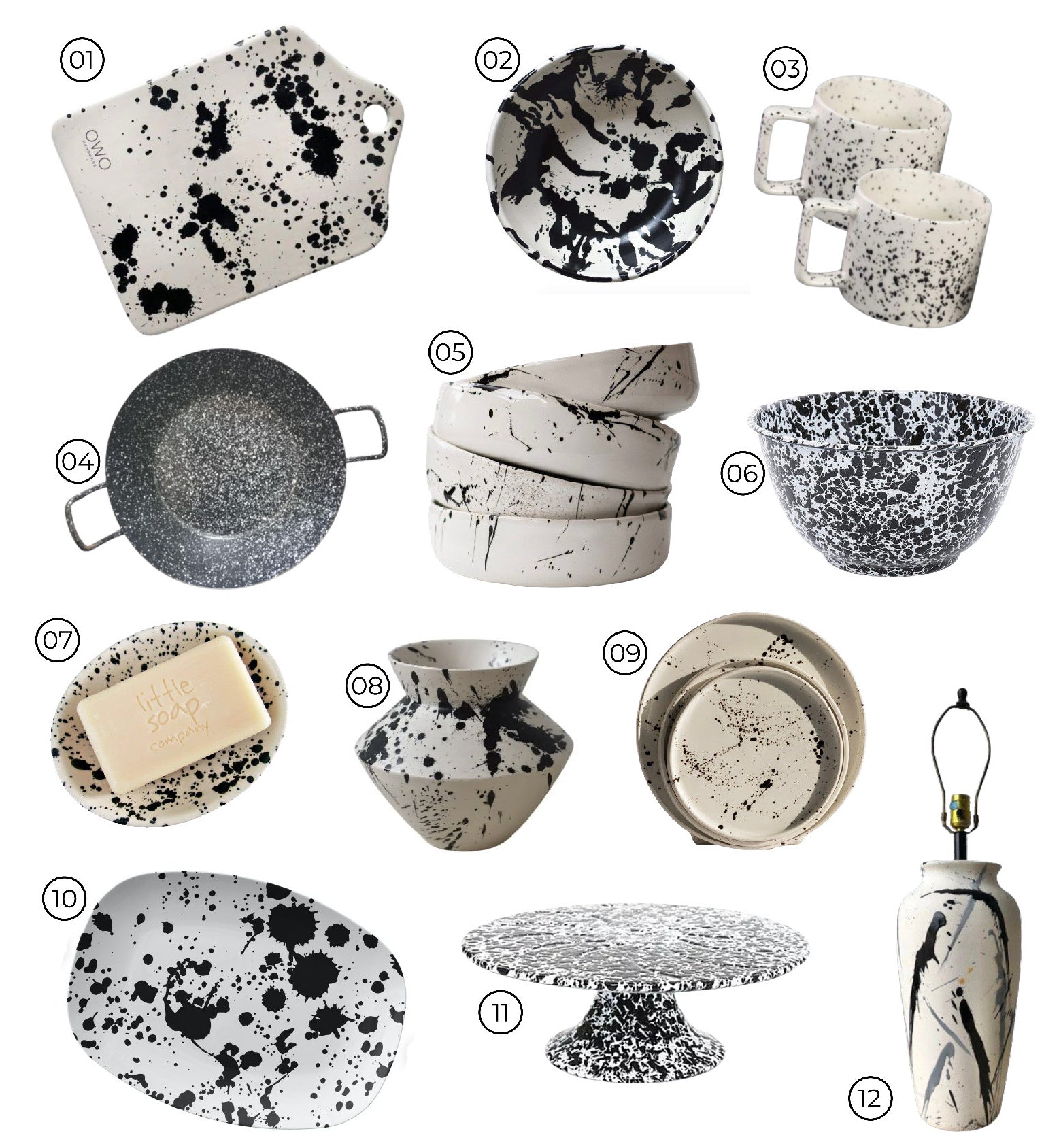 Eventually, the trend landed here in America, most notably with Marlborough and Roseville pottery manufacturers. Vintage collectors hunt down these pieces, but if you prefer a more modern take on the splatter, you’ve got plenty to pick from. Check out Tory Burch’s Spongewear Collection, Crow Canyon, Hodd House, West Elm, and March SF. While a more traditional black and white style is still going strong, there are now tons of different options to shop.